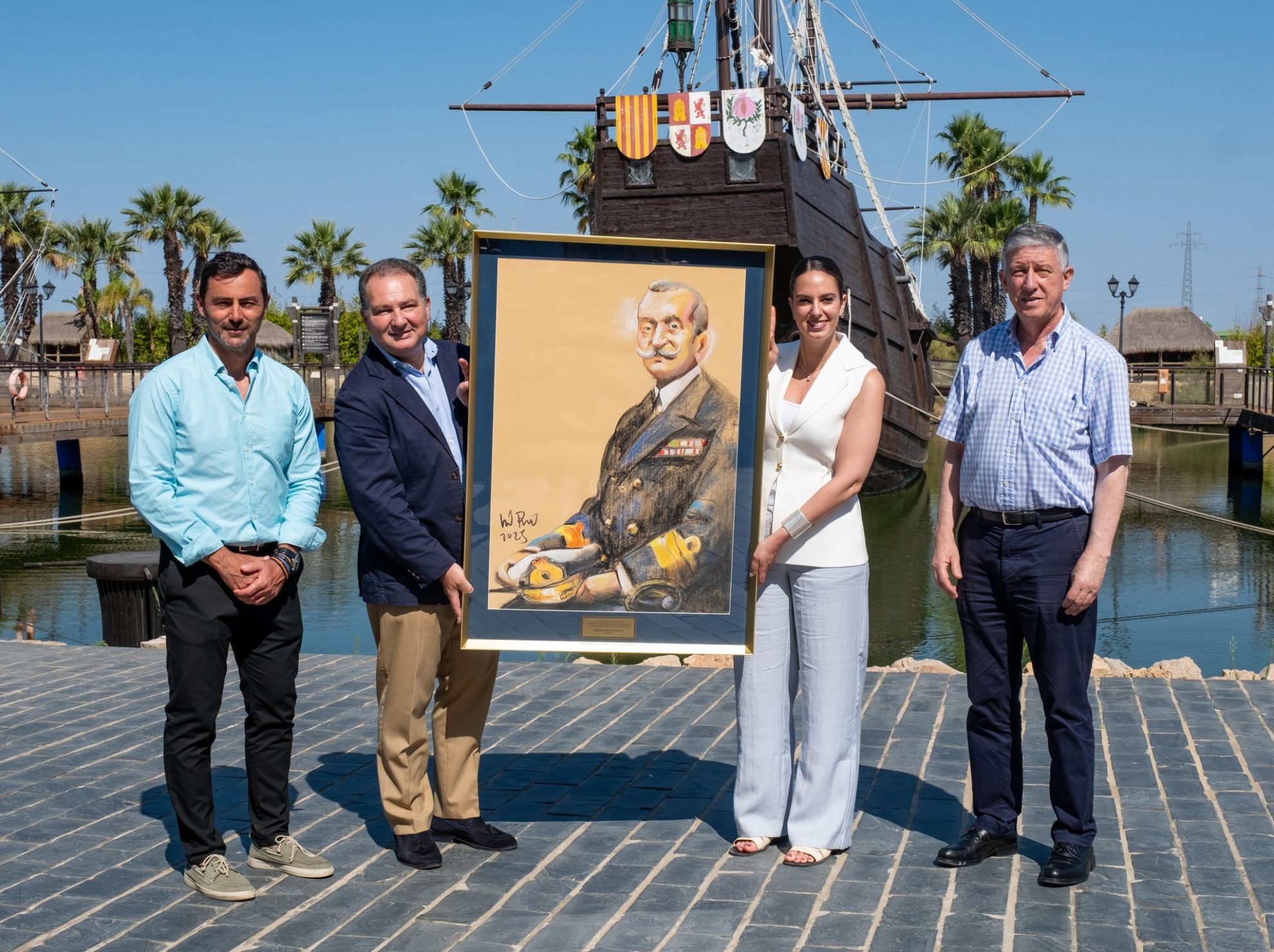 Coincidiendo con la visita al Muelle, el presidente ha hecho entrega a la alcaldesa de Palos, de un cuadro conmemorativo obra del artista onubense Víctor Pulido, que rinde homenaje a Honorio Cornejo Carvajal, el que fuera ministro de Marina durante la dictadura de Primo de Rivera y cuyo impulso fue decisivo para que el Plus Ultra despegara desde este lugar.