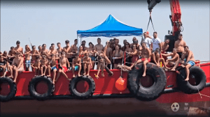 Decenas de participantes ocupan sitio en la embarcación que porta el mástil con la ansiada bandera a capturar, en un ejercicio de equilibrio que solo los más capaces superan… o las más capaces. Porque este año, el destino y la Virgen del Carmen, ha querido que, por primera vez desde que se recuerda la tradición, una mujer consiga hacerse con ella. Su nombre es Clara Rodríguez Martínez y es nieta de dos personas entrañables y muy conocidas en el pueblo: Isabelo y Lala.