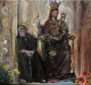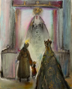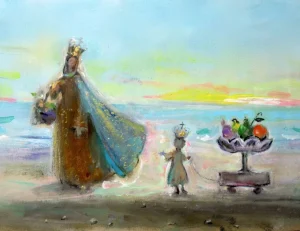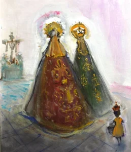 Esa jerarquía se traduce en recursos plásticos reconocibles. “Nunca sitúo a la Virgen en un plano meramente terrenal; está en su nube de gloria. Puede rozar lo cotidiano, por ejemplo con un paseo por la playa, un gesto cercano, pero permanece en un espacio idealizado”. Cuando aparecen personas, suelen ser santos u otras figuras del misterio; y, si hay un mortal, es porque la obra alude a su tránsito hacia la otra vida. La cercanía no banaliza, sino que acerca.