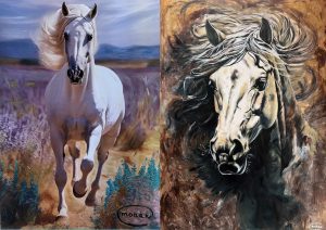 También dibuja caballos, todo un desafío para ella. “La verdad es que no ha sido fácil pintar caballos y detrás hay un largo tiempo de estudio porque su anatomía es compleja”. El reto tuvo a su padre como detonante: “hazme un caballo blanco al trote”, le pidió. A base de intentos y bocetos truncados, acabó convirtiendo esa dificultad en una nueva temática en su obra personal, con retratos ecuestres que aúnan fuerza y detalles de maestría en su ejecución.