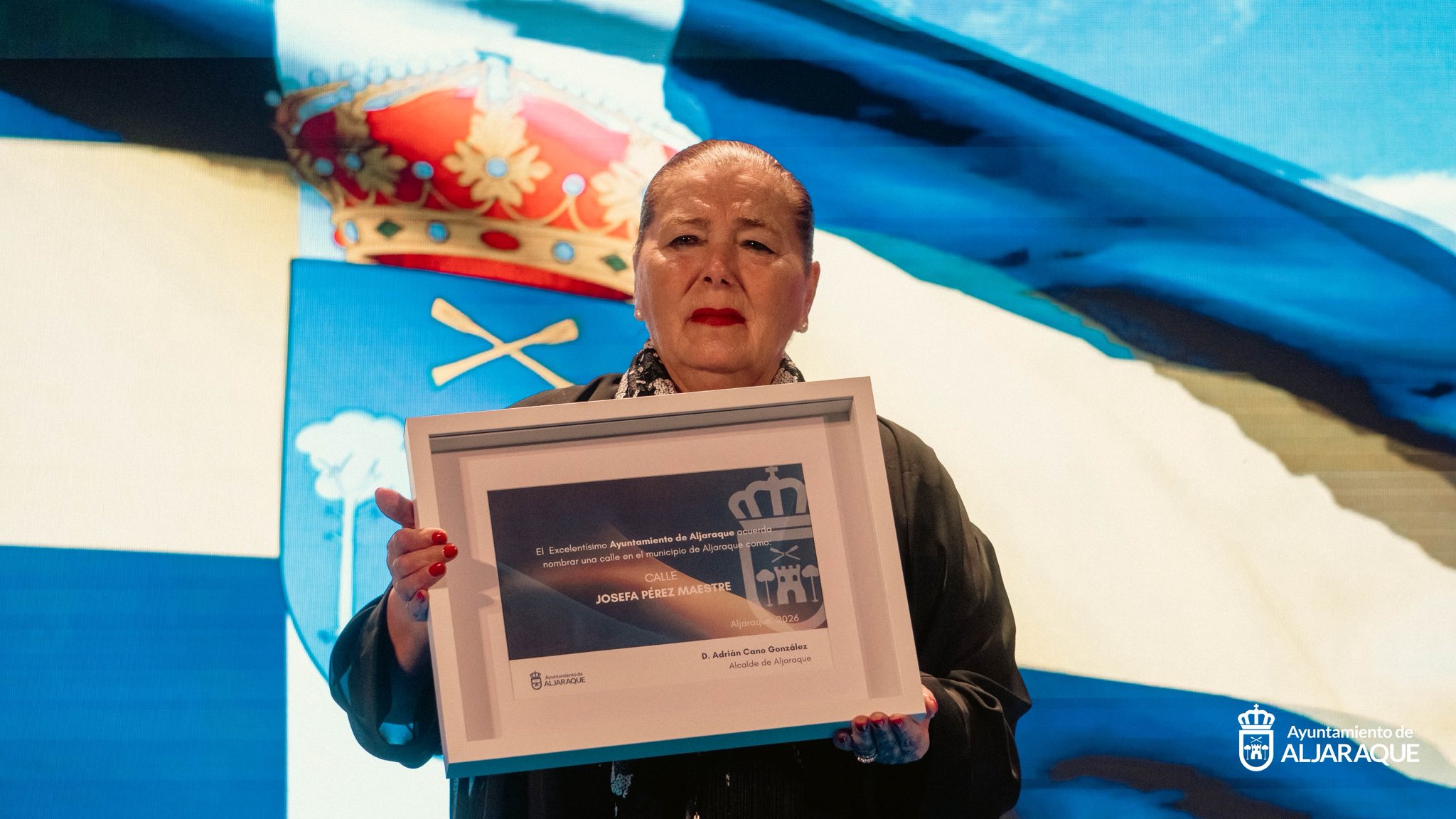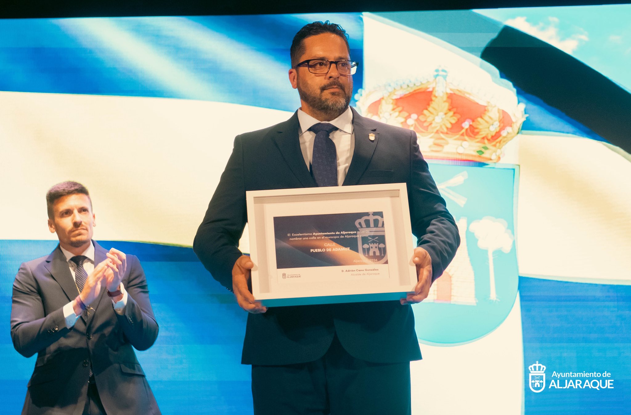 Asimismo, Josefa Pérez Maestre y José María Sánchez Román `Jomasan’ fueron reconocidos con la denominación de nuevas calles del municipio por su entrega al pueblo de Aljaraque. Por último, se reconoció al Pueblo de Adamuz por su ayuda a los vecinos aljaraqueños y onubenses accidentados en el trágico accidente ocurrido en le mes de enero. El momento de la recogida del rótulo con el nombre del municipio cordobés con el que se nombrará también una de las calles de Aljaraque, fue especialmente emotivo en el Teatro Cinema de Corrales.