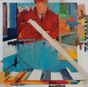 Cada pieza funciona como una especie de collage pictórico. Antonio parte de imágenes, símbolos y elementos reconocibles del universo musical para transformarlos después en pintura, mezclando referencias personales con una memoria colectiva compartida. “No quería hacer una reinterpretación al uso de portadas de discos, sino llevarlas a mi manera, desde artistas y grupos que tienen que ver conmigo y con mi trayectoria vital”, señala.